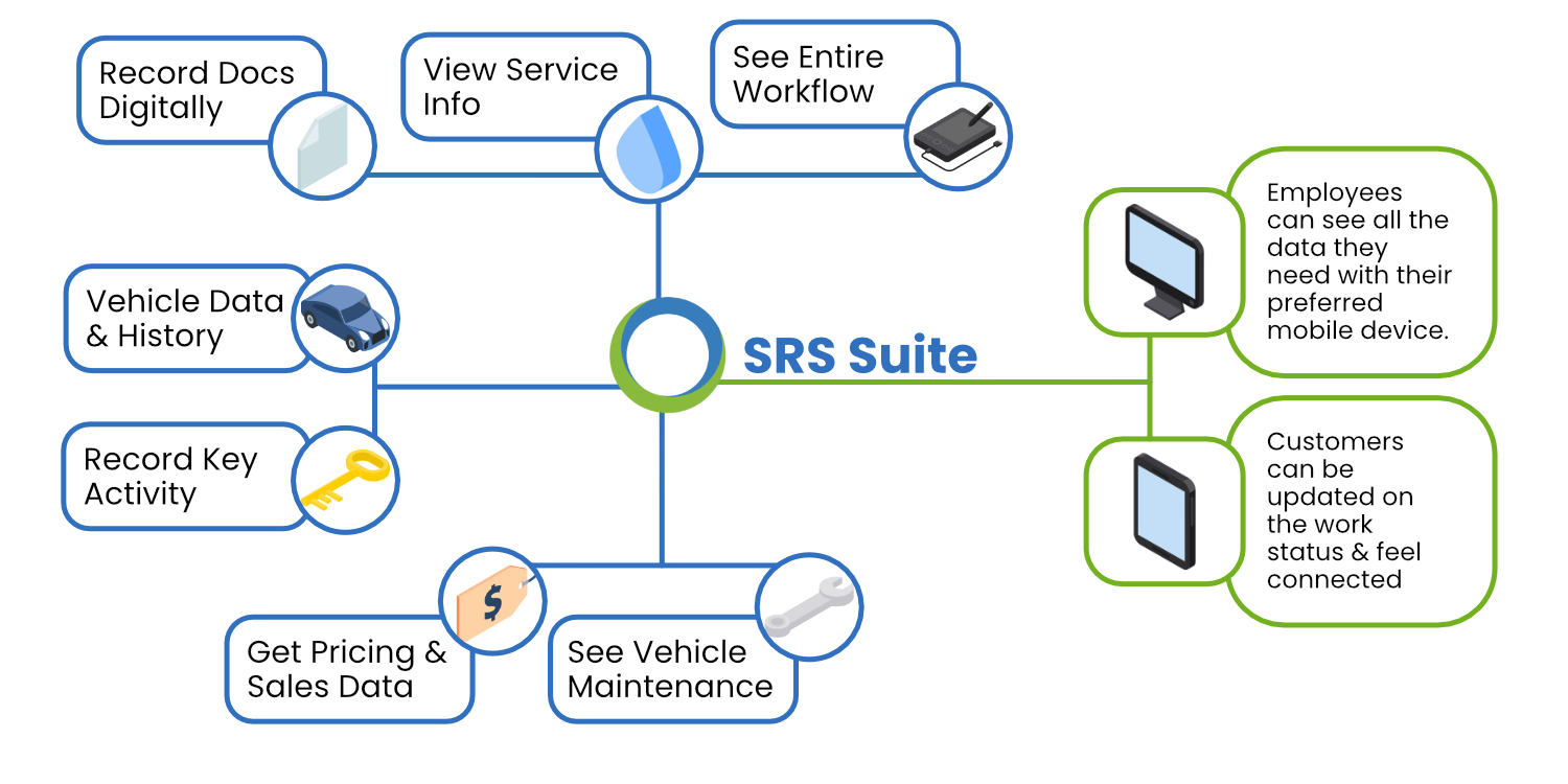 This software is designed for Car Dealerships, Reconditioning/Detailing Companies, suppliers or any other business that deals with vehicles. SRS Suite integrates with any business within the automotive industry in any combination including: